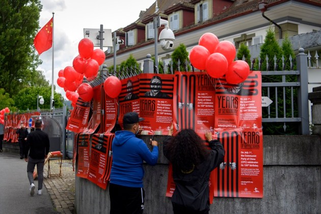 Switzerland too witnessed similar protests. In this photo, activists attach protest posters at the fences of the Chinese Embassy in Bern, Switzerland. (AP Photo)