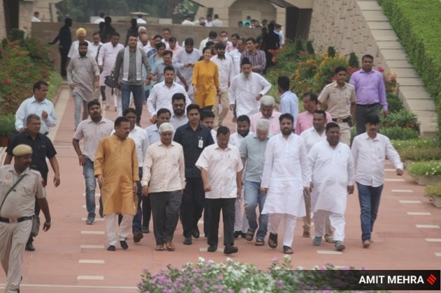 AAP MLAs reach Rajghat to join other party leaders. (Express Photo)