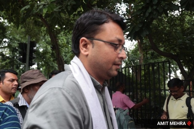 Arvind Kejriwal said that the people have elected a "hardcore honest" government in Delhi. In picture, another party person can be seen entering Rajghat premises. (Express Photo)