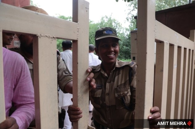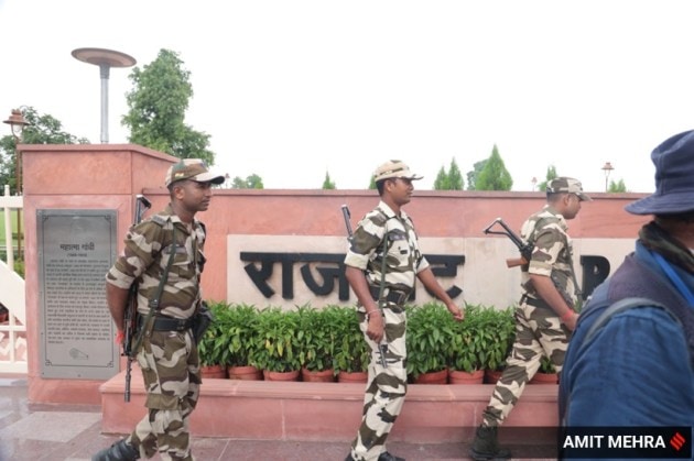 Recently AAP has been at the receiving end with Manish Sisodia's residence being raided by the CBI. In photo, a security personnel stands guard at Rajghat. (Express Photo)
