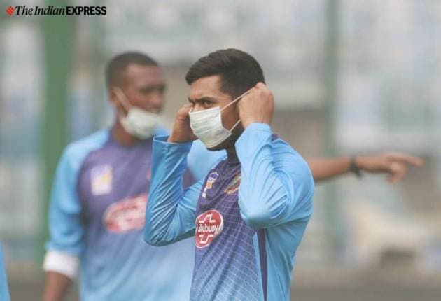 Bangladesh players wear masks while practicing for India-Bangladesh series at Arun Jaitely stadium in New Delhi on Friday. (Express photo by Praveen Khanna)