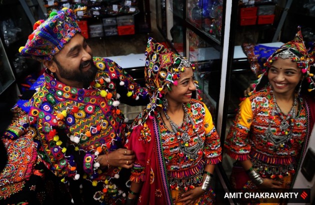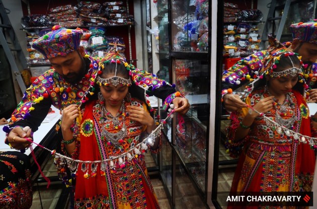 A couple tries out new dresses for Dandiya Raas Garba performance during the nine days Navratri festival at a shop in Mumbai's Ghatkopar on Tuesday, Sept. 20. (Express Photo by Amit Chakravarty )