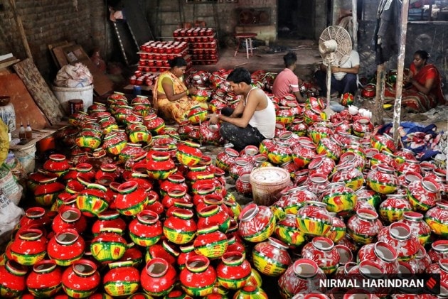 Workers engaged in painting decorative clay pots or matkas ahead of the Navratri sales at a pottery workshop in Ahmedabad on Sunday, Sept. 18. (Express Photo by Nirmal Harindran)