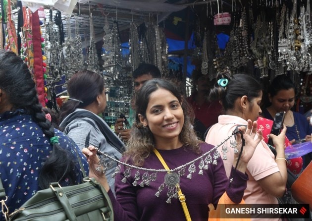 A woman purchases jewellery ahead of Navratri festival at Bhuleshwar Market, in Mumbai on Tuesday, Sept. 20. (Express Photo by Ganesh Shirsekar)