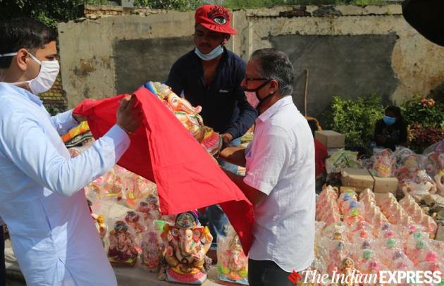 Workers of Nagarkar Talim Ganesh Mandal have decided to install idol within the existing premises rather than erecting a pandal on Laxmi Road like every year. After the installation, an arati was performed by maintaining social distancing. Express Photo by Pavan khengre.