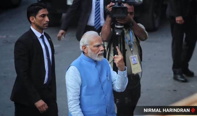 The second and final phase of voting for 93 constituencies across 14 districts in the central and north regions of Gujarat began on Monday. This picture captures Prime Minister Narendra Modi after he cast his vote early in the morning at a polling station set up at a high school in Ranip locality in Ahmedabad. (Express Photo by Nirmal Harindran)