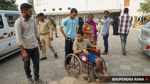 A voter on a wheelchair leaves a polling booth after casting his vote on Monday. The counting of votes will take place on December 8. (Express Photo by Bhupendra Rana)