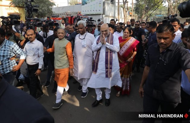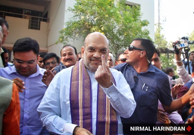 Union Home Minister and BJP MP Amit Shah poses for the camera after casting his vote at the AMC sub-zonal office in Naranpura locality, Ahmedabad. (Express Photo)
