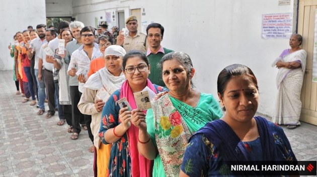 At 1 pm, voter turnout stands at 34.74 percent. As seen in this picture, voting is in progress at Ghatlodiya assembly constituency, Ahmedabad. (Express photo by Nirmal Harindran,)