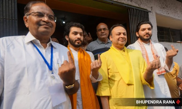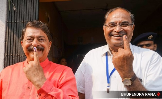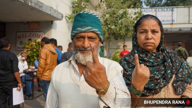 A voter turnout of 19.17 per cent was recorded till 11:30 am. In this picture, seers can be seen after registering their votes outside a polling booth in the state. (Express Photo by Bhupendra Rana)