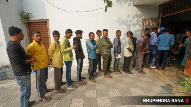 The 93 seats account for altogether 2.51 crore voters, even as 833 candidates, including 764 males and 69 females, are in the fray. In this picture, voters can be seen lined up early in the morning to cast their vote for the Assembly bypolls. (Express Photo by Bhupendra Rana)