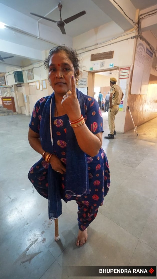 In the Gujarat elections this time, the incumbent BJP is facing a challenge from Arvind Kejriwal-led Aam Aadmi Party (AAP) besides the principal Opposition Congress. In this picture, a voter walking on a support looks at the camera after casting her vote in one of the polling booths in the state. (Express Photo by Bhupendra Rana)