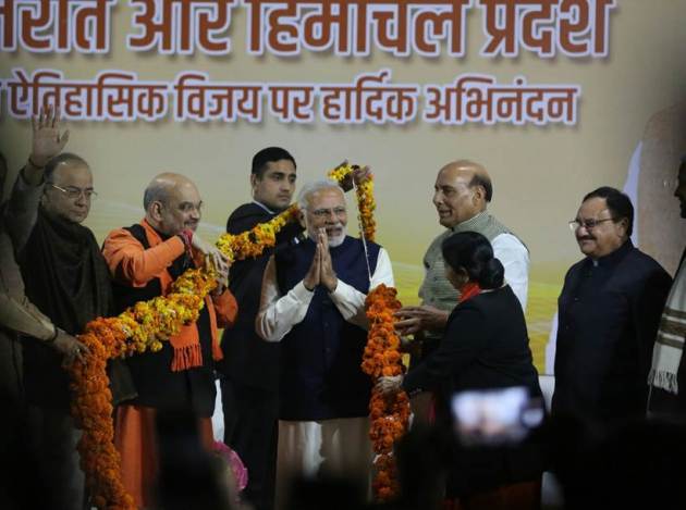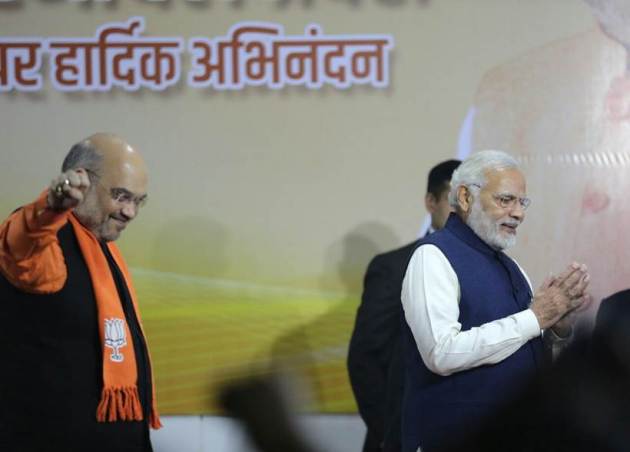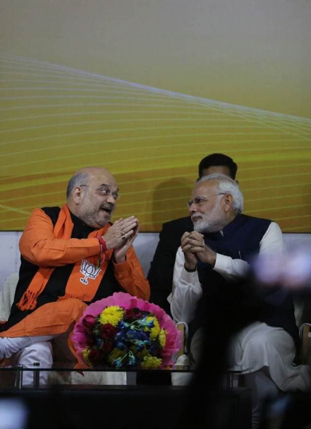 PM Narendra Modi and Amit Shah at the BJP headquarters in New Delhi, celebrating the party's victory in Gujarat and Himachal. (Express photo)