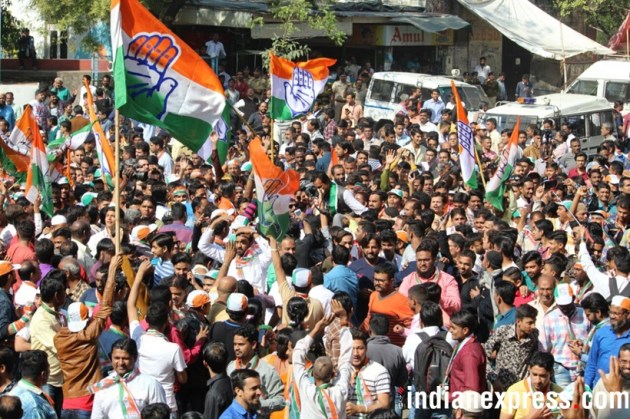 The Congress has however, put up a strong fight against the incumbent BJP in Gujarat this time. Congress workers celebrate in Vadodara. (Express Photo)