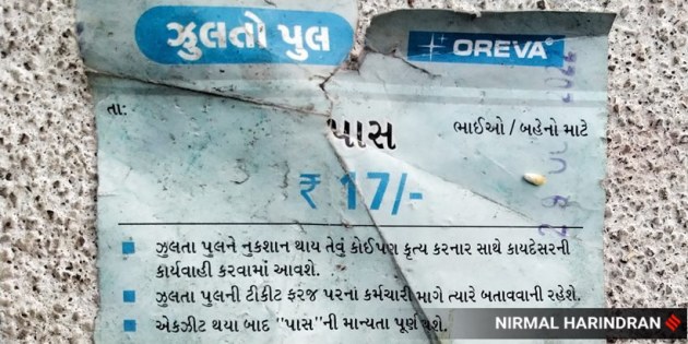 A torn ticket presumably bought by a visitor at the Morbi bridge worth Rs 17, a remnant of the tragedy that unfolded Sunday evening. (Express Photo by Nirmal Harindran)