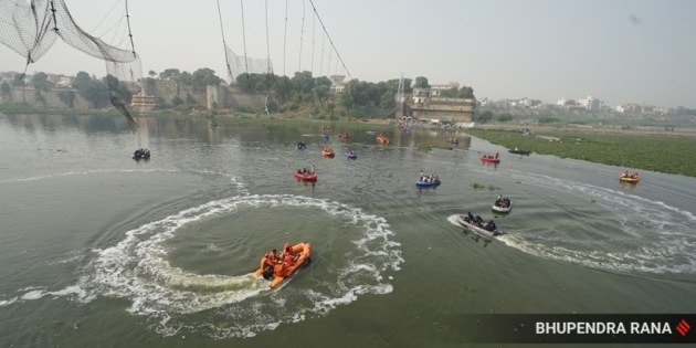 In this picture, rescue operations are being conducted by the NDRF team using inflatable boats, for the third day at Morbi's Machchhu river. (Express Photo by Bhupendra Rana)