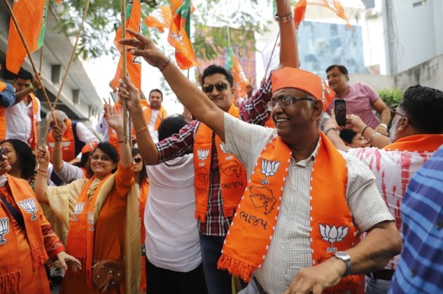 Celebrations in Gujarat have begun as the BJP looks set to win the Assembly elections with record numbers. The BJP, which was limited to 99 seats five years ago, is on course to win more than 150 seats today. This is more than its previous highest tally of 127. (Express Photo by Nirmal Harindran)