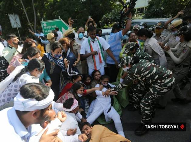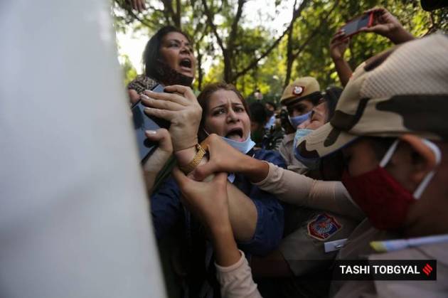 Members of various political and students outfits were detained by police at the UP Bhavan in Delhi during a protest against the Hathras gangrape. (Express Photo by Tashi Tobgyal