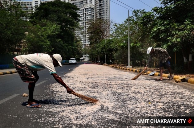 As April temperature increases, Maharashtra experiences heat waves. In this picture, local fishermen are seen drying their fresh catch (shrimps) on a stretch at the back roads of Nerul in Navi Mumbai, Thursday.(Express photo by Amit Chakravarty)