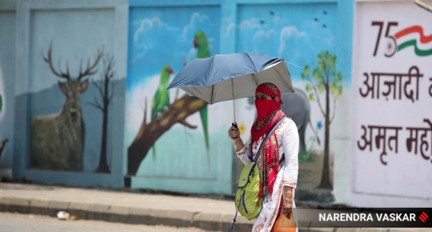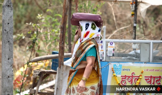 A woman uses a bag to protect herself from the sun, on a hot summer day, near Ghansoli in Navi Mumbai (Express photo by Narendra Vaskar)