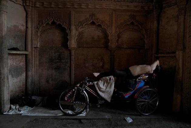 A man rests on his rickshaw on a hot summer day in Lucknow, Uttar Pradesh, Thursday (AP)