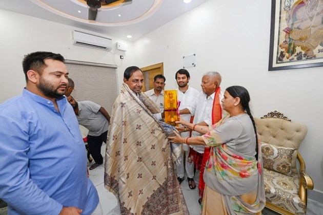 The meeting was significant as both the chief ministers are posited to take on the BJP in the 2024 elections. In photo, KCR meets former Bihar CMs, Lalu Prasad and Rabri Devi in Patna. (PTI)