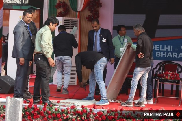 Workers dismantle the podium after PM Modi cancelled his arrival.