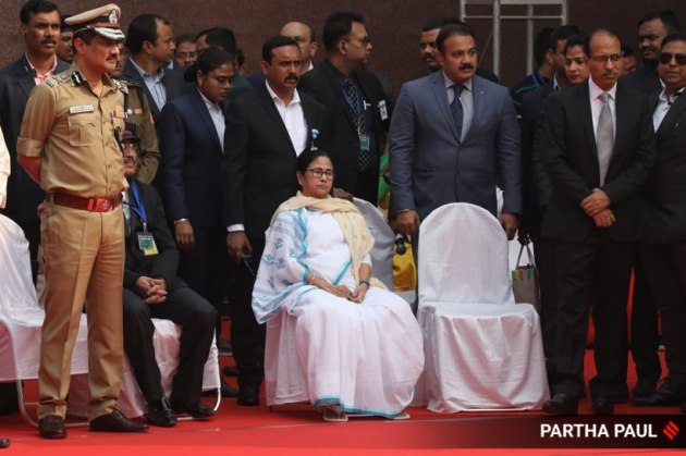 High drama prevailed at Howrah Station on Friday during the inauguration of the Vande Bharat Express to New Jalpaiguri. In pic: West Bengal Chief Minister Mamata Banerjee refuses to get up on the dais as BJP workers chanted 'Jai Shri Ram' as she came.