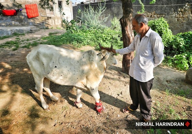 Babubha Jadeja tends to his cow Kajal which has contracted Lumpy Skin Disease at Bhujpour village, Kutch. (Express Photo by Nirmal Harindran)