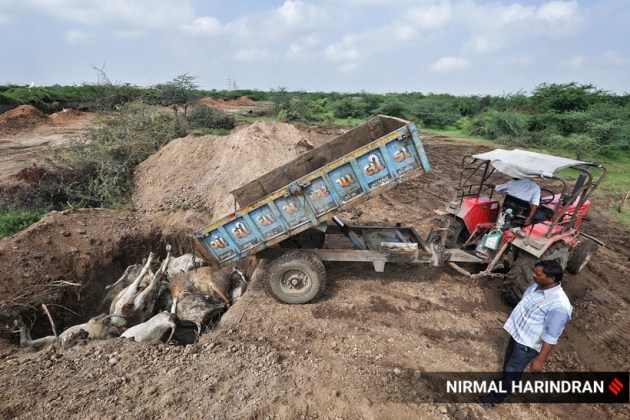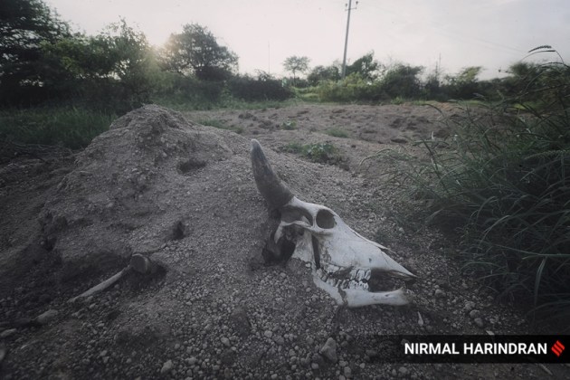 Trenches and bloating cattle carcasses on the pastoral land adjoining the Mundra-Mandvi coastal highway, suggest high casualty numbers. In this picture, a carcass of cattle which succumbed to Lumpy Skin Disease is seen dumped for burial in a field at Bhujpour village, Kutch. (Express Photo by Nirmal Harindran)