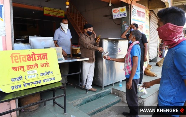 As announced by CM Uddhav Thackeray, Shiv Bhojan Thali centres have started free distribution of food to those in need. In Pic: A Shiv Bhojan Thali centre at Gultekdi Marketyard, Pune.