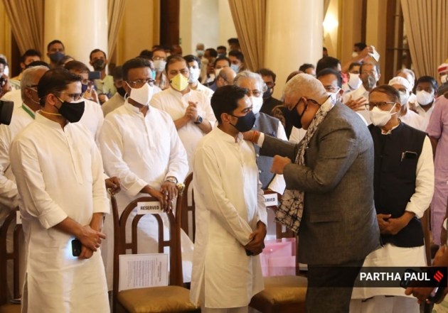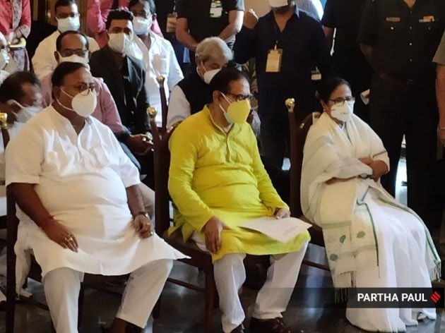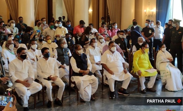 Mamata Banerjee's predecessor Buddhadeb Bhattacharjee, leader of Opposition of the outgoing House Abdul Mannan, and CPI(M) veteran leader Biman Bose were present at the oath ceremony. (Express Photo by Partha Paul)