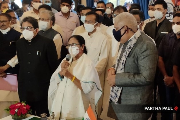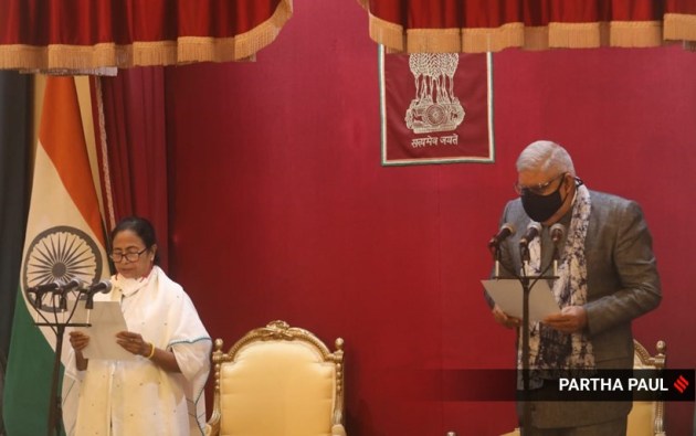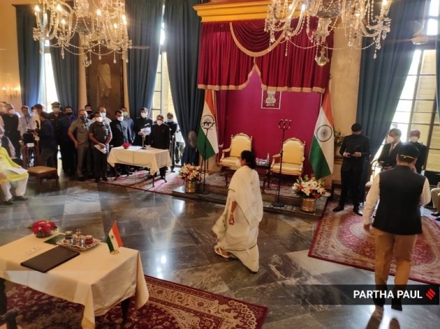 After the ceremony, Mamata Banerjee told reporters her first priority would be to tackle Covid and also appealed to people to maintain peace following post-poll violence in West Bengal. (Express Photo by Partha Paul)