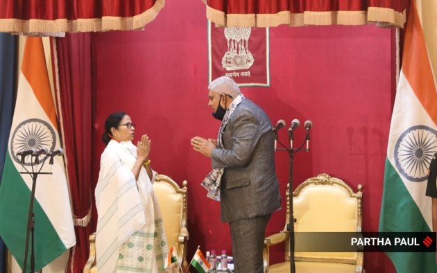 TMC chief Mamata Banerjee greets Governor Jadgeep Dhankar ahead of her swearing-in ceremony. (Express Photo by Partha Paul)