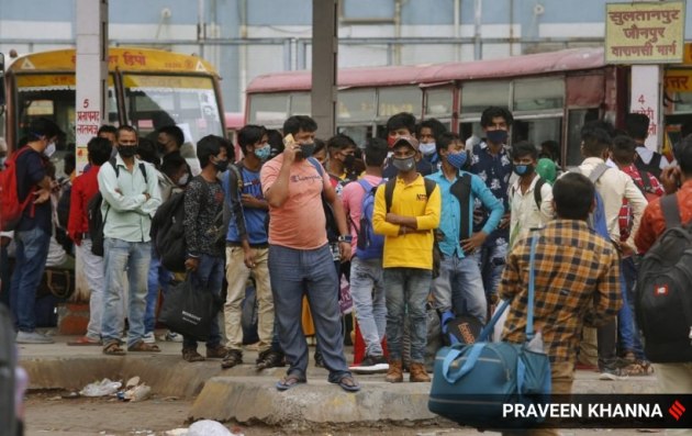 Migrant labourers wait for buses at Anand Vihar ISBT to ferry them to their home town