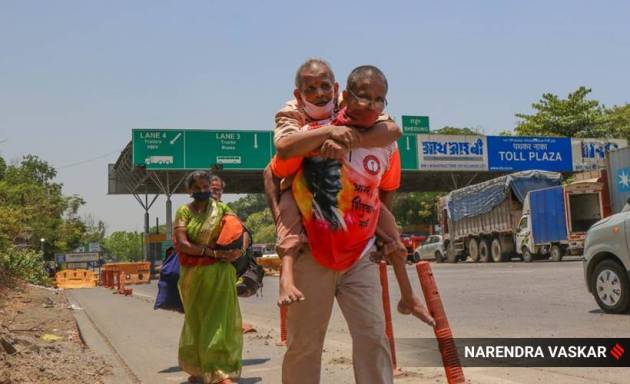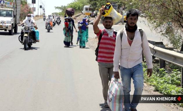Migrants walk towards Katraj from Warje area in Pune after they were reportedly evicted for not paying rent on time.