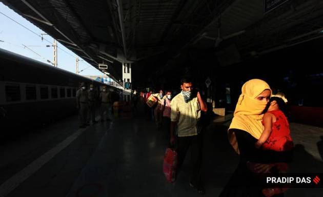 A top official from the Railways told The Indian Express, “There is no hurry. Maintaining social distancing and health protocol, trains will run every day for the entire period of the lockdown. In pic: Migrant workers outside LTT station in Mumbai on Friday, May 8, 2020.