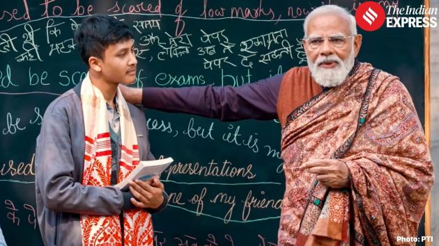 The ninth edition of Pariksha Pe Charcha, showed students from different parts of the country, including Assam, Manipur, Gujarat, Tamil Nadu, Chhattisgarh, Goa, Punjab, Chandigarh, Ladakh, and Rajasthan, interacting with PM Modi at his residence in Delhi, with questions on examinations (Source: Photo by PTI)