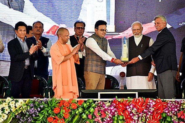 With the chant of 'Har Har Mahadev', Prime Minister Narendra Modi Saturday laid the foundation stone of the international cricket stadium in his parliamentary constituency Varanasi. In this picture, PM Modi along with UP CM Yogi Adityanath, BCCI President Roger Binny, BCCI Secretary Jay Shah, former cricketer Sachin Tendulkar, former Indian cricket coach Ravi Shastri and other dignitaries are seen on the dais. (ANI Photo)
