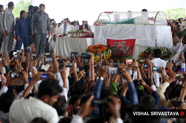 His son and party chief Akhilesh Yadav lit the funeral pyre. A large number of people were present for the leader's funeral. (Express photo by Vishal Srivastav)