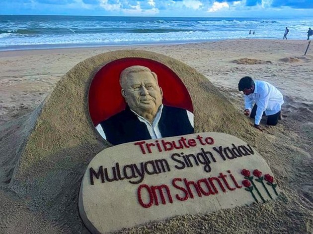Sand artist Sudarsan Pattnaik creates a sculpture to pay tribute to Samajwadi Party founder Mulayam Singh Yadav, in Puri. (PTI)