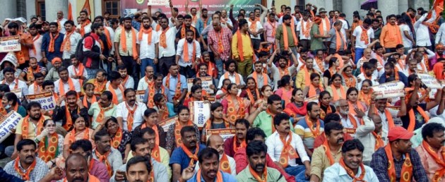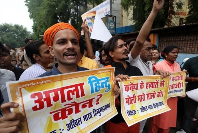 Activists from right wing parties shout slogans in New Delhi, on Wednesday, June 29. (AP Photo/Manish Swarup)