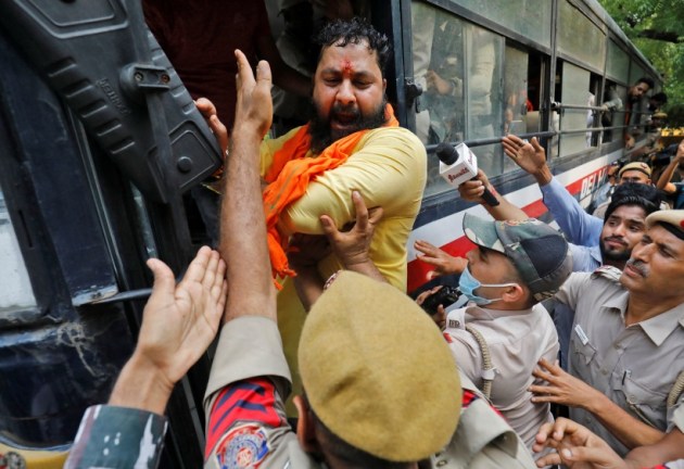 An activist of the Bajrang Dal reacts after he was detained by police during a protest against the killing of a Hindu man in Udaipur, in New Delhi on Wednesday. (REUTERS/Amit Dave)