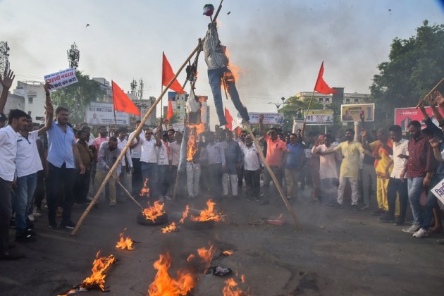 Members of Vishva Hindu Parishad (VHP) and Bajrang Dal burn an effigy during a protest against the killing of tailor Kanhaiya Lal, in Gurugram, Wednesday, June 29, 2022. (PTI Photo)