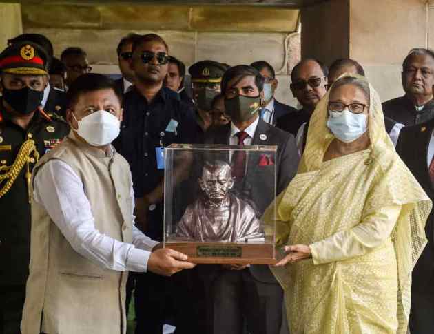 Bangladesh Prime Minister Sheikh Hasina received a memento after paying homage to Mahatma Gandhi at his memorial Rajghat. (PTI Photo/Manvender Vashist Lav)
