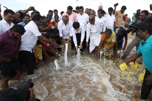 Mylapore DMK MLA Dha Velu and Principal Secretary (Cooperation) Dr J Radhakrishnan joined hundreds of people in a procession at Nochikuppam, carrying pots of milk in their hands, which they emptied later at the Marina beach. (Twitter/@RAKRI1)