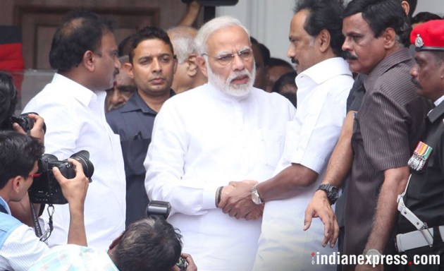Prime Minister Narendra Modi on Wednesday traveled to Chennai to pay his last respects to former Tamil Nadu CM M Karunanidhi. After the news of his demise, the PM described Karunanidhi as “one of the senior most leaders of India”. (Express Photo)