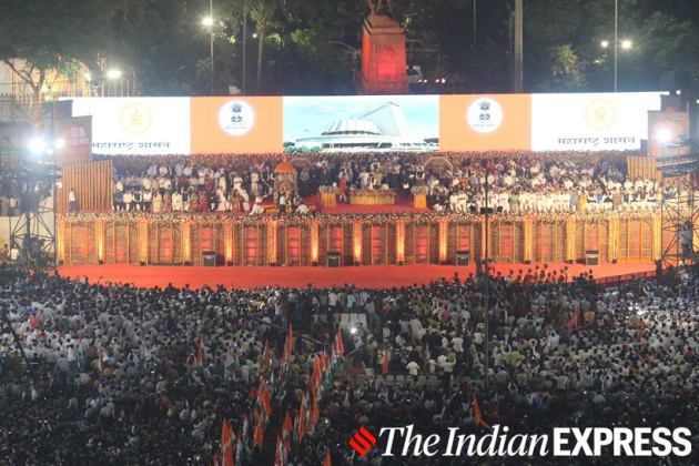 Governor Bhagat Singh Koshyari administered oath to the saffron-clad Thackeray and other ministers at the sprawling Shivaji Park. (Express photo: Prashant Nadkar)