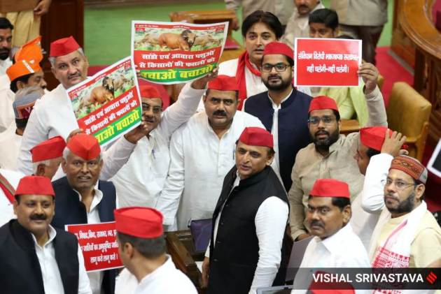 As soon as the House met, SP members carrying placards raised issues related to law and order, farmers, stray cattle, and incidents of rape. They also raised slogans against the Governor.