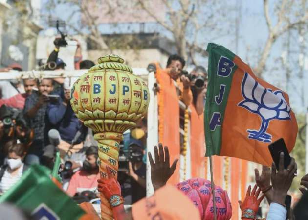 Varanasi: BJP supporters during a roadshow by Prime Minister Narendra Modi for the seventh and last phase of UP Assembly elections, in Varanasi district, Friday, March 4, 2022. (PTI Photo)